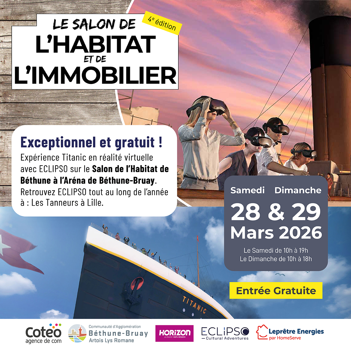 Pendant 2 jours, venez vivre une expérience unique sur notre salon de l'habitat de Béthune. Découvrez le paquebot mythique le "Titanic" en réalité virtuelle.